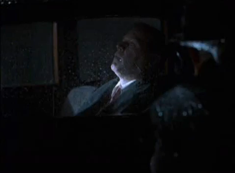 Figures 5 & 6 are of the dead driver in the car from two different angles. In shot 5, we see a figure on the right of the screen peering in the window and in shot 6 the dead man is lit from outside of the car with the majority of the light hitting his neck and his eyes are almost completely hidden from view.